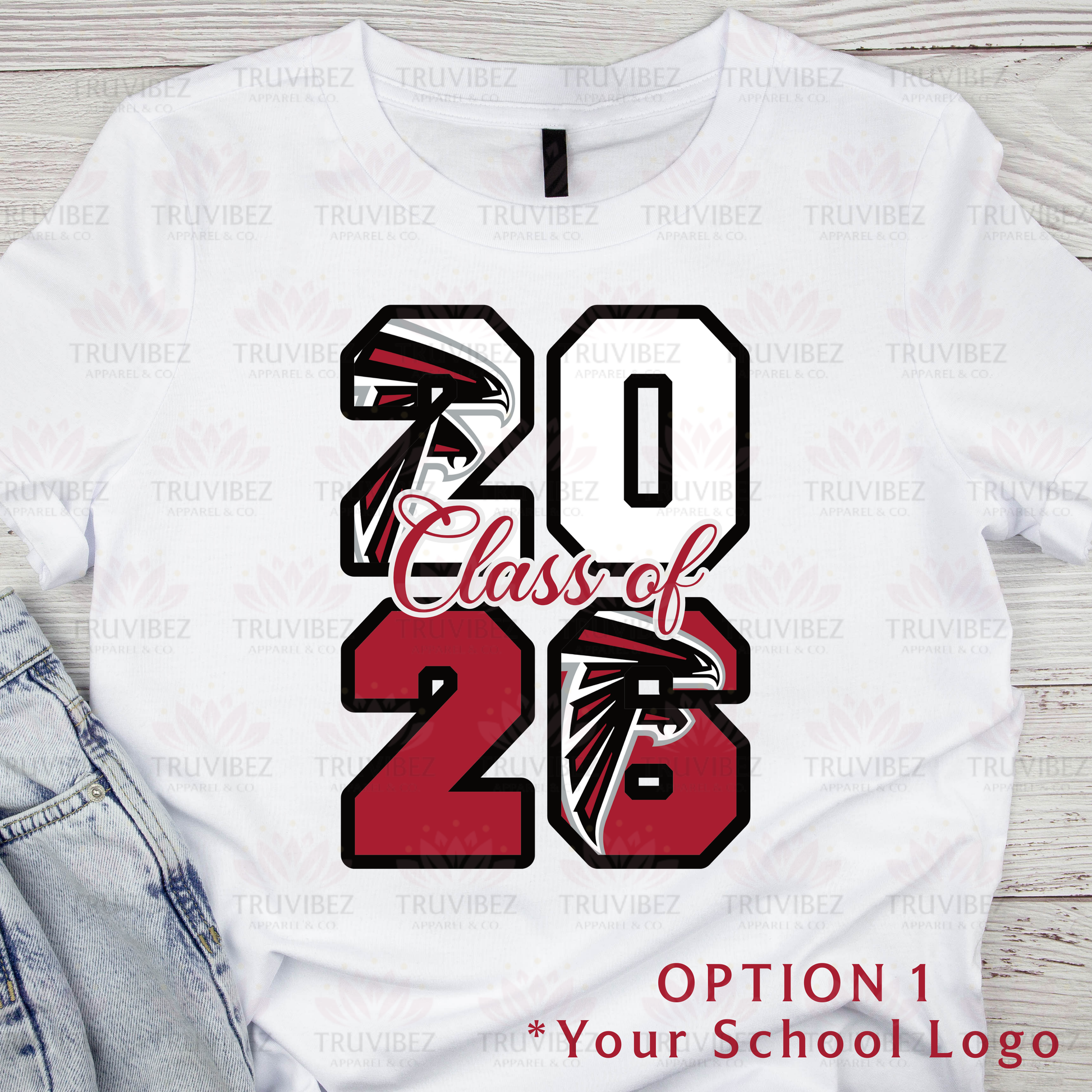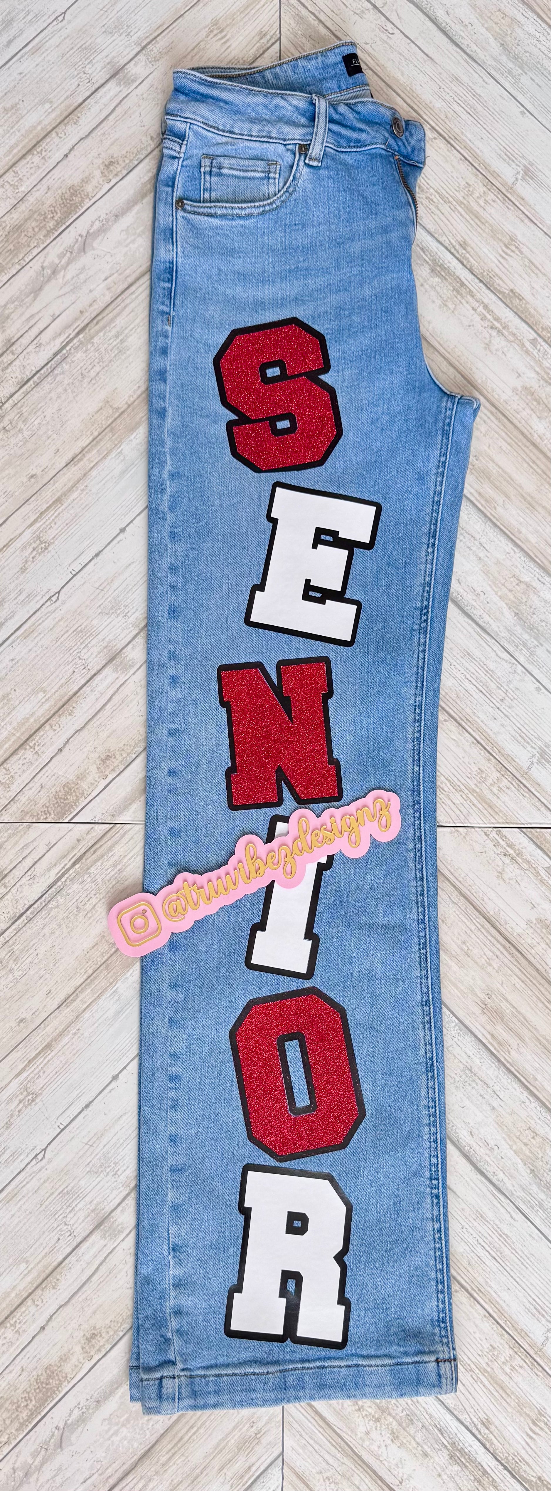 Celebrate your graduation in style with our Custom Grad Jeans! Each pair is uniquely designed with your school logo and personalized details to make your milestone unforgettable.