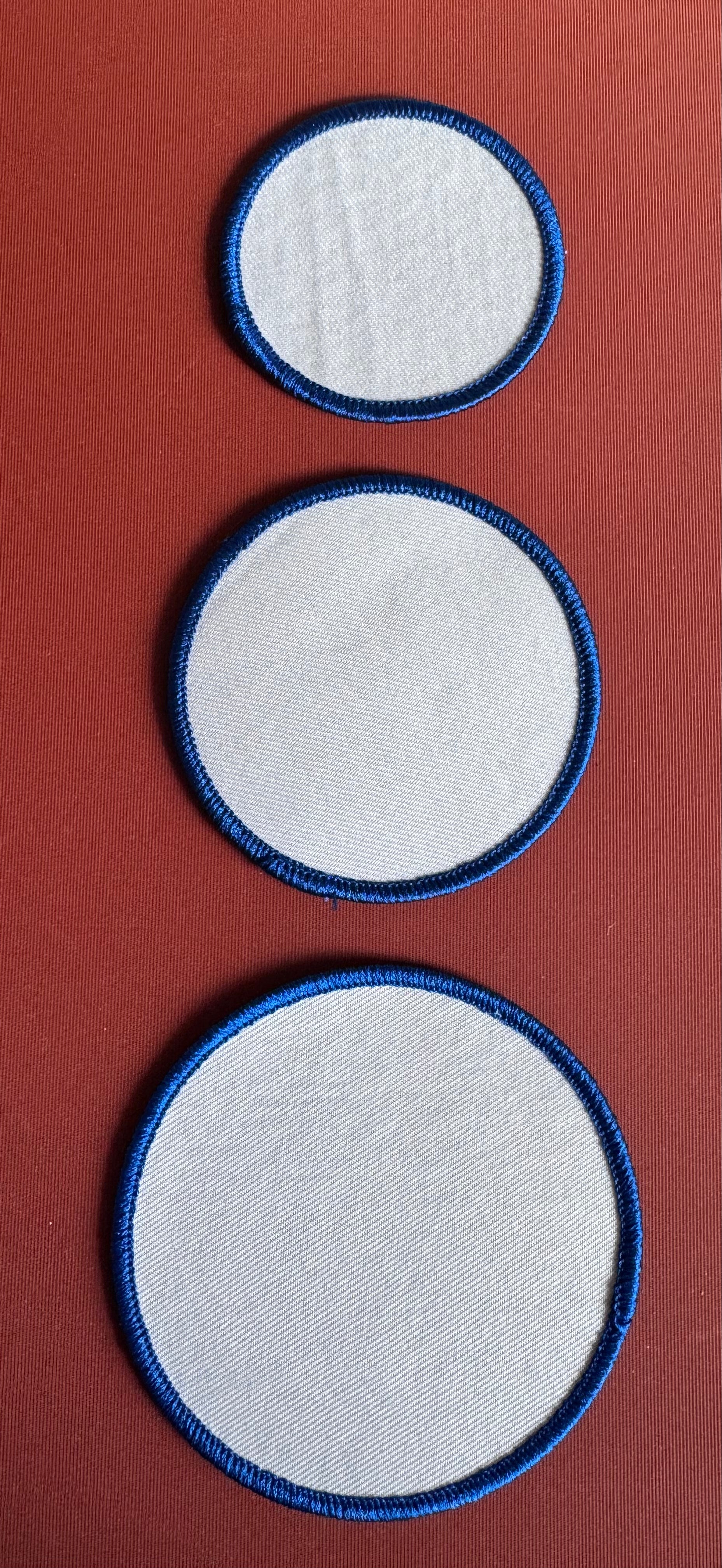 Current sizes available are 2.5", 3", and 3.5" round or rectangle shapes. The boarder satin trim comes in colors of red, blue, navy blue, black yellow and white.