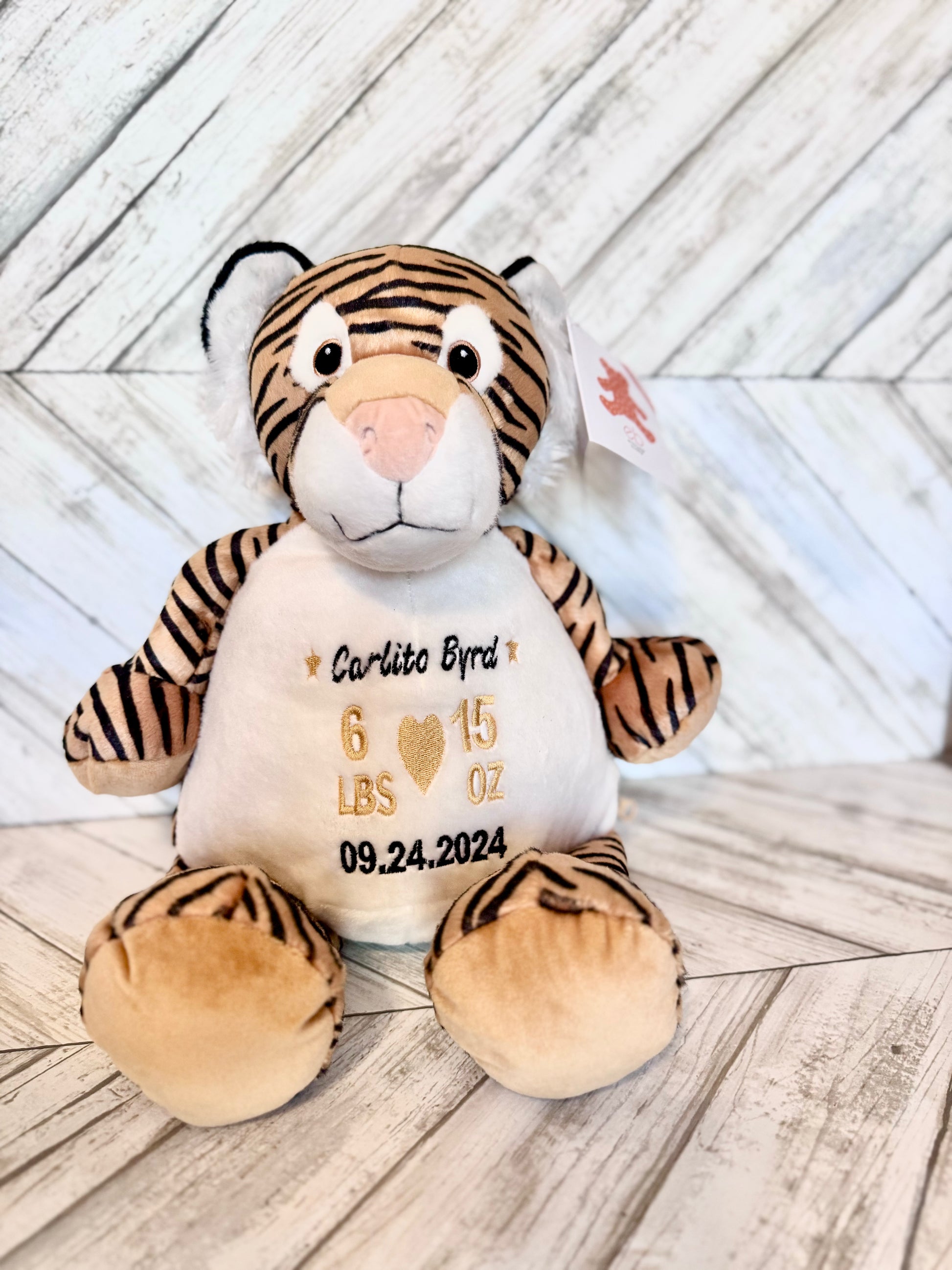Welcome your little one into the world with a personalized touch! This soft, cuddly plush tiger is perfect for newborn announcements or as a unique keepsake. Embroidered with your child’s name, this adorable stuffed toy makes a thoughtful gift for baby showers, birthdays, or just to celebrate a new addition to the family.