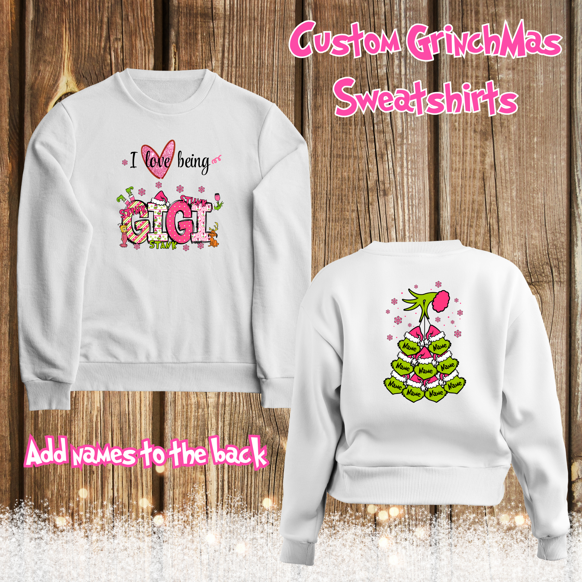 Custom Grinchmas Sweatshirt. Enter names for the back in the notes section.