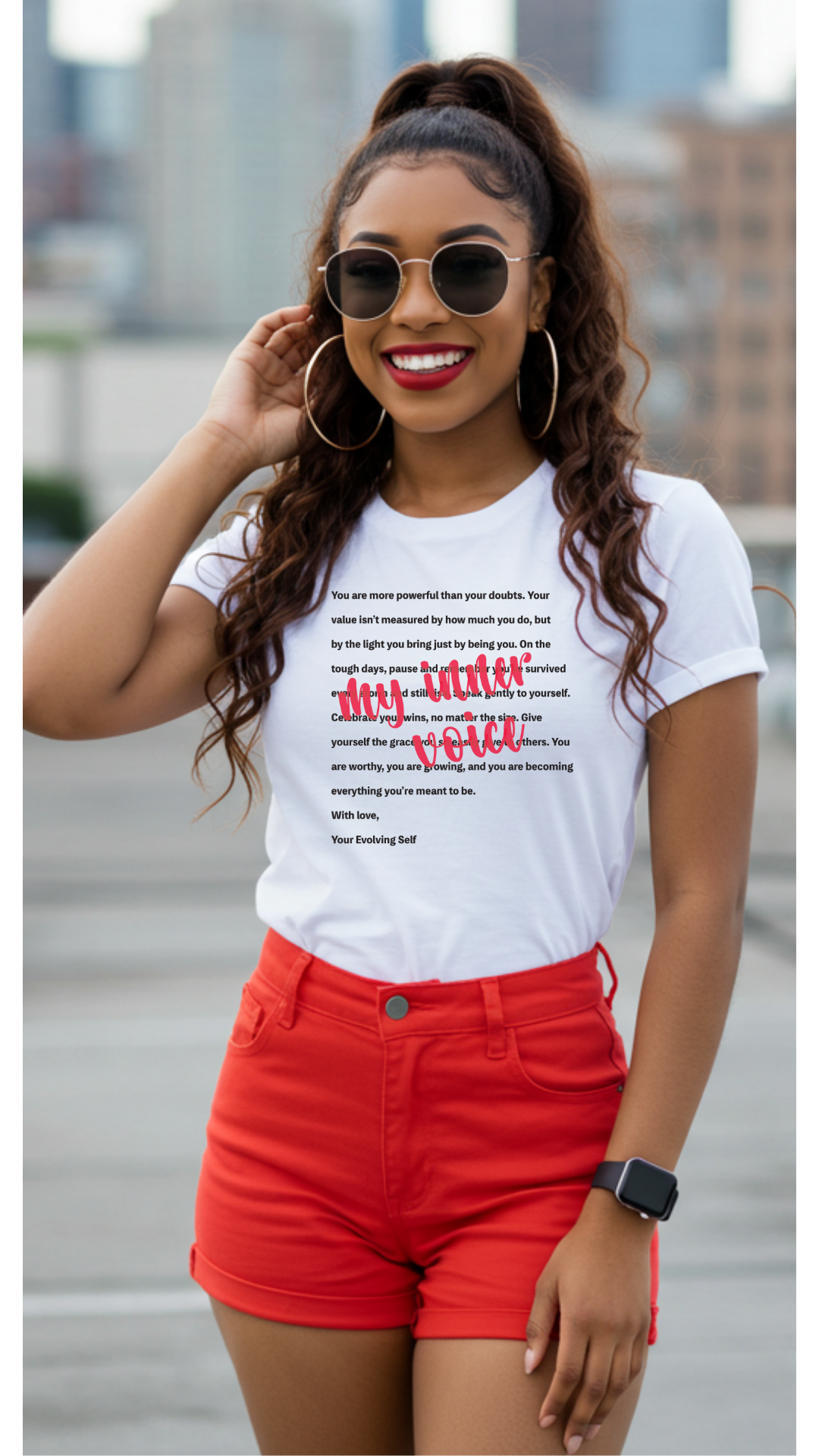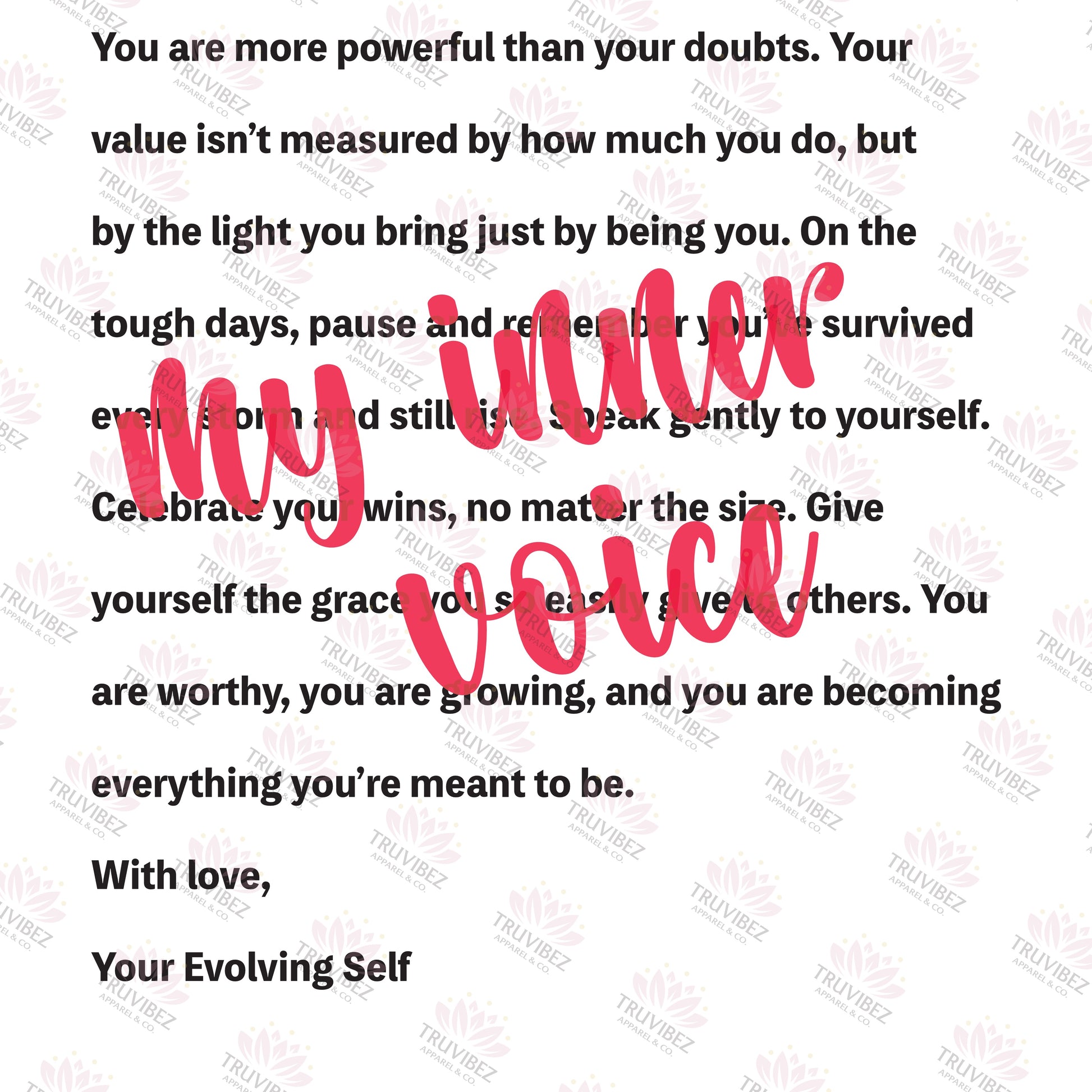 Boost your self-esteem with our My Inner Voice tee. Make a powerful statement about self worth and positivity with every wear. Let your inner voice speak positivity over yourself and inspire others to do the same. Stay confident and spread good vibes with this stylish tee.