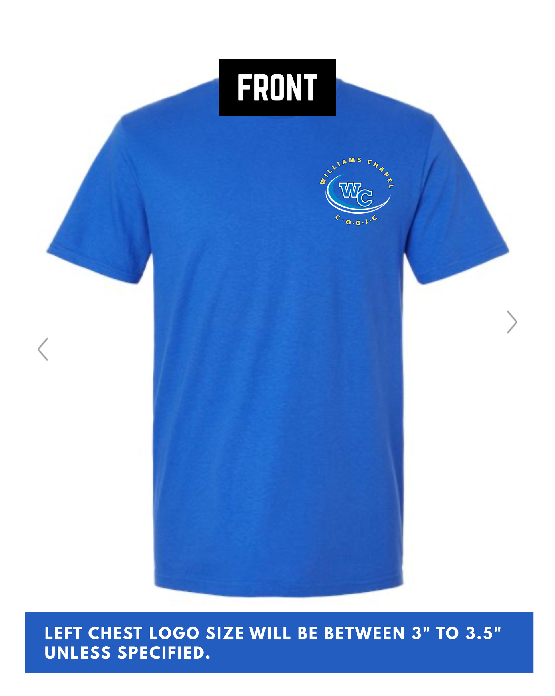 This custom order is for Williams Chapel C.O.G.I.C. church apparel featuring the official logo printed on a blue shirt, with a scripture message displayed on the back.